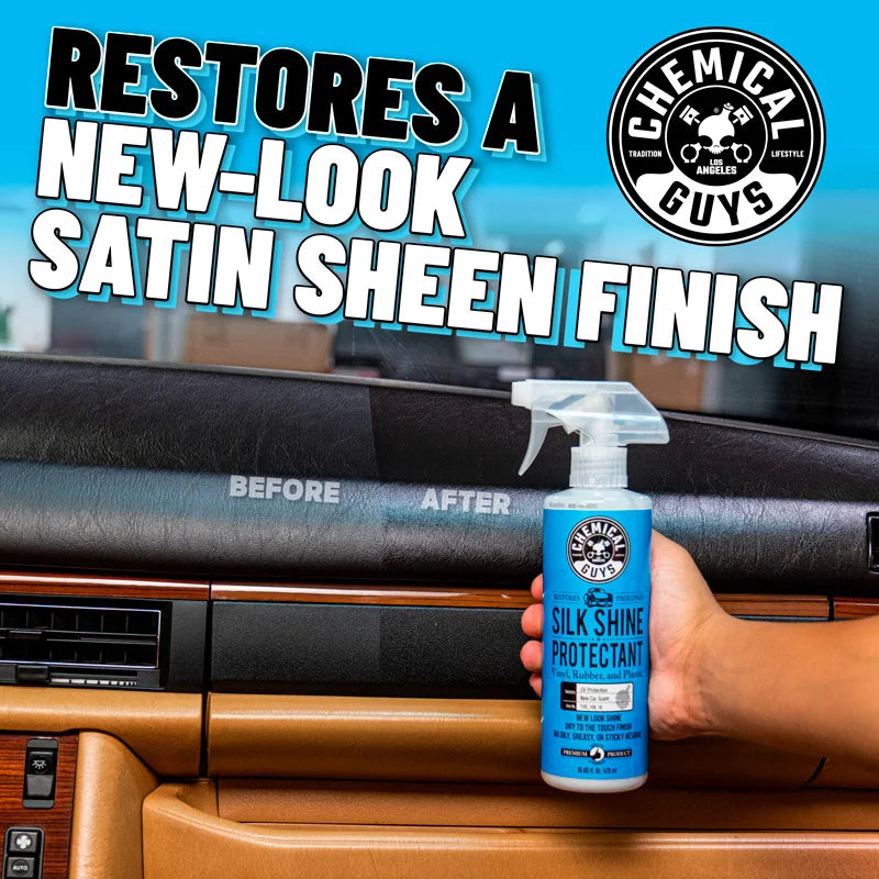 Verleihen Sie Kunststoff, Gummi und Vinyl mit Chemical Guys Silk Shine Spray Dressing neuen Glanz. Dieses Spray auf Wasserbasis sorgt für einen seidenmatten Schimmer in Erstausrüsterqualität – ein dezentes, mattes Finish ohne fettige Rückstände – und bietet langanhaltenden Schutz vor UV-Strahlung, Ausbleichen und Austrocknung.